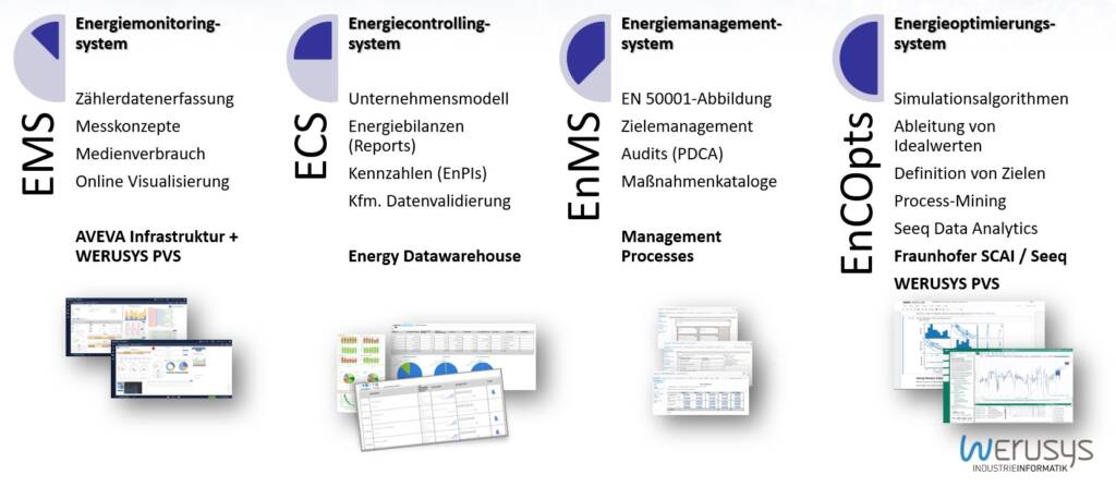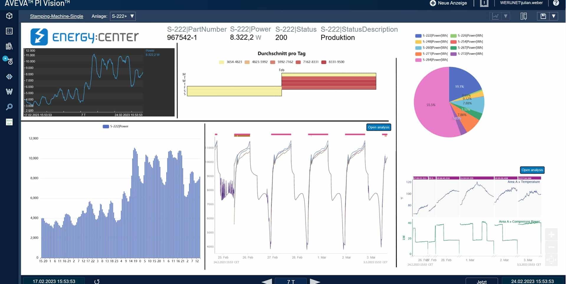 In version 2023.1, the energy:center has seamless integration into the AVEVA PI system. By extending the possibilities of PI Vision, detailed and clear energy monitoring is possible. Overall, the Werusys energy:center is divided into four main areas. Energy monitoring, controlling, management and optimization.